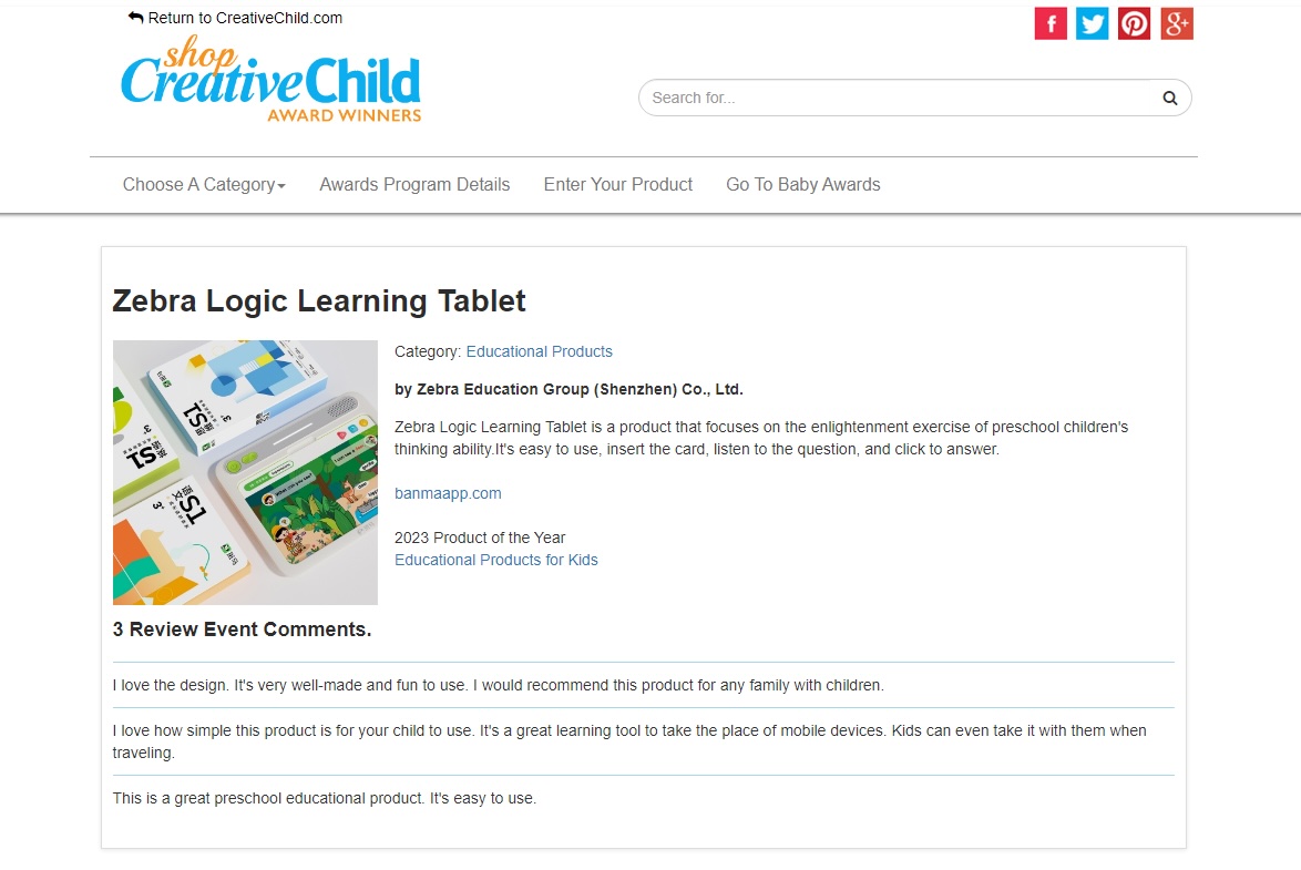 | Creative Child Awards | 儿童创意大奖,儿童创造力培养领域享有盛誉的国际大奖 | 证明 | 2023 年 |