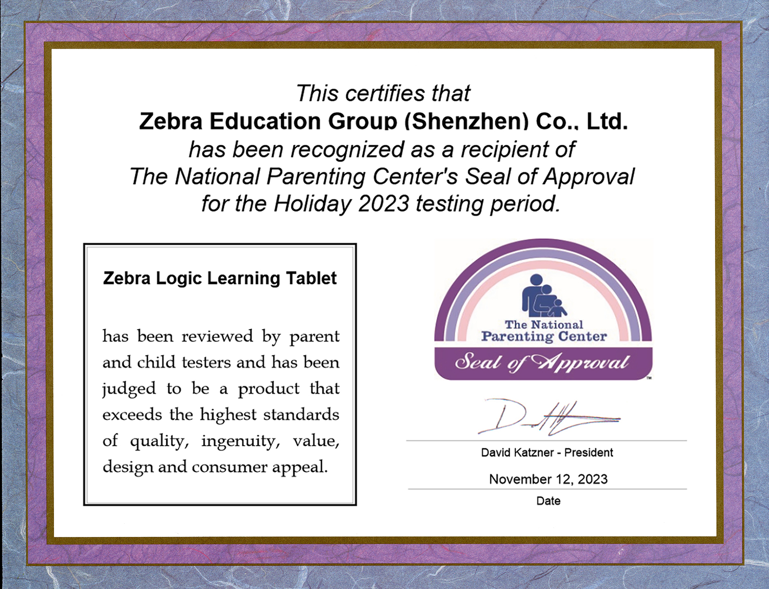| The National Parenting Center Seal of Approval | 美国国家育儿中心专业认证 | 证书 | 2023 年 |