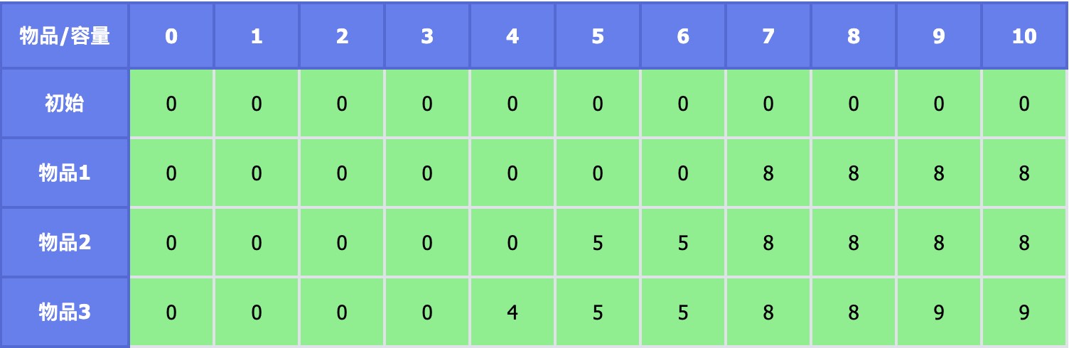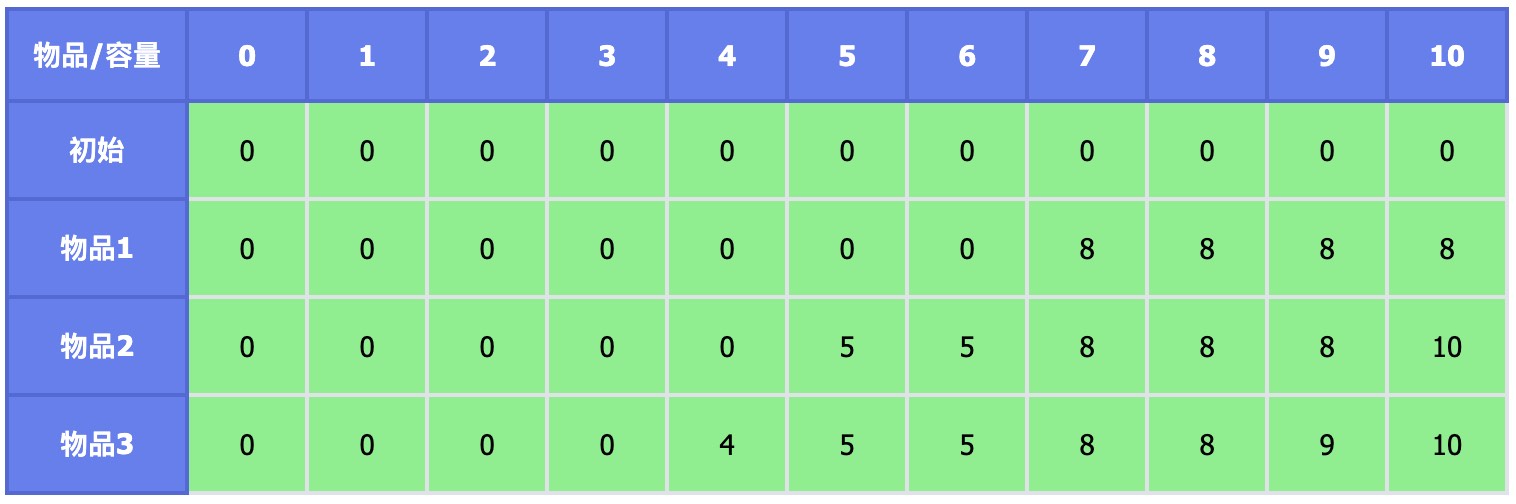 我们再用刚刚的例子来做一下表格演示:背包容量是 10L。
