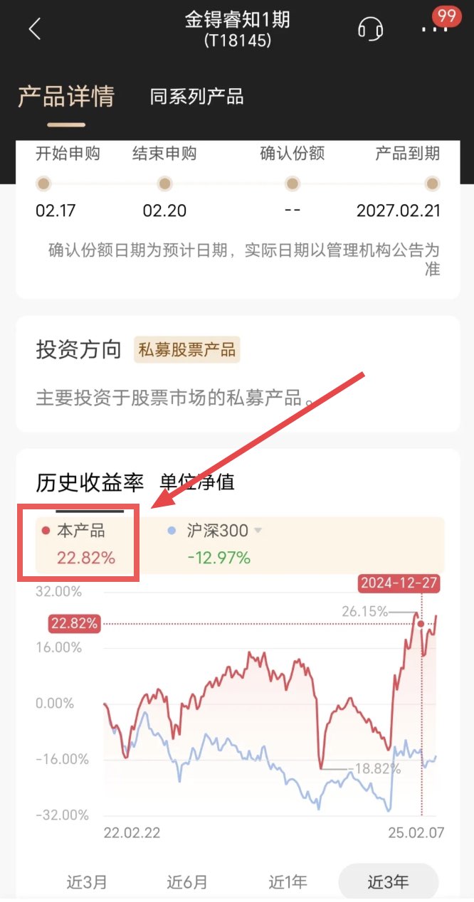 我持有的名字为金锝睿知 1 期(T18145)的产品显示,从它的发行开始日 22.2.22 开始到 24.12.27,这段时间的收益率是 22.82%(如下图)